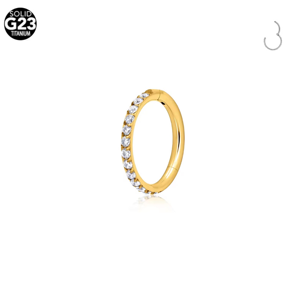 Kolczyk typu clicker wykonany z tytanu G23 w kolorze złotym z wysadzanymi drobnymi kryształkami na rancie. Ozdoba łatwa w aplikacji ze względu na ruchomą część zamykaną na tzw. click. Ze względu na grubość kółka (1mm) kolczyk jest dedykowany do płatka nosa (nostril). Można sterylizować (+2zł).