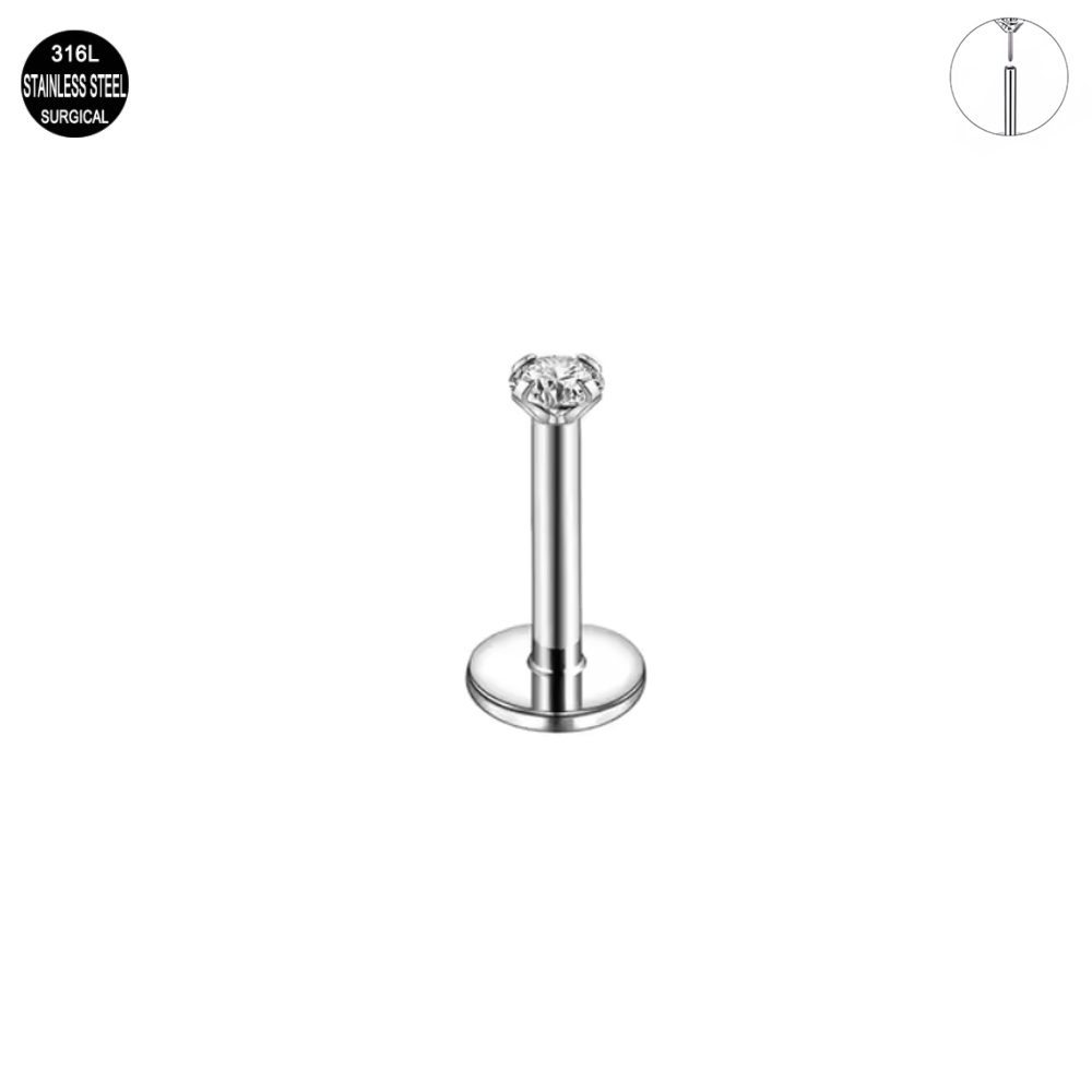 Kolczyk typu labret wykonany ze stali chirurgicznej 316L z małym kryształkiem 2mm. Idealna ozdoba do nostrila. Grubość pręta 1mm jest najlepsza do płatka noska. Kolczyk posiada ozdobę push-in czyli bez gwintu, wystarczy wcisnąć. Można sterylizować (+2zł).
