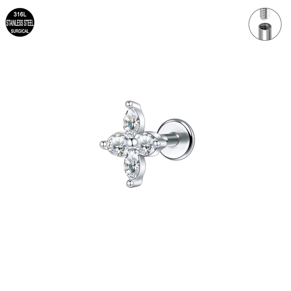 Kolczyk typu labret wykonany ze stali chirurgicznej 316L z 3 kryształami i dekorami. Ozdoba z gwintem wewnętrznym (GW), co znacznie ułatwia przykręcanie nakrętki. Piękny kolczyk do wygojonych kanałów, można sterylizować (+2zł).