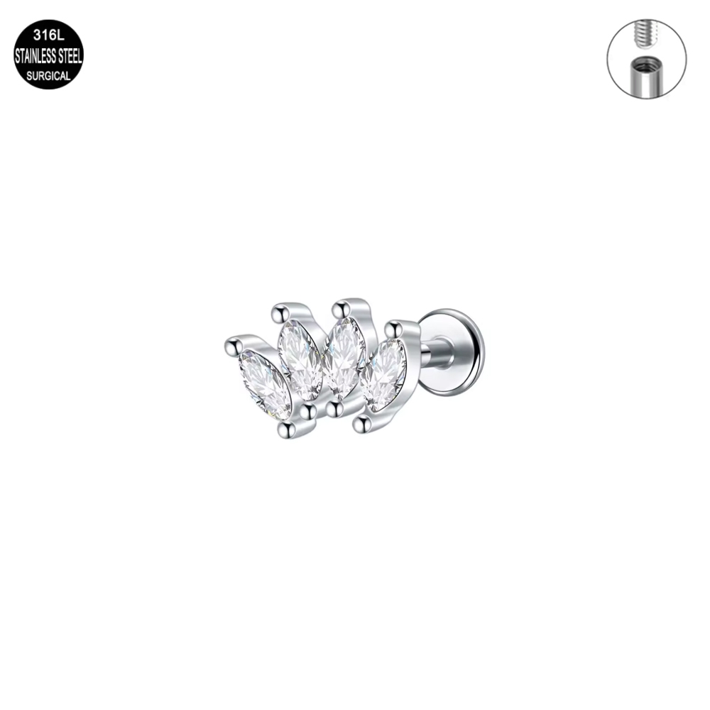 Kolczyk typu labret wykonany ze stali chirurgicznej 316L z 3 kryształami i dekorami. Ozdoba z gwintem wewnętrznym (GW), co znacznie ułatwia przykręcanie nakrętki. Piękny kolczyk do wygojonych kanałów, można sterylizować (+2zł).