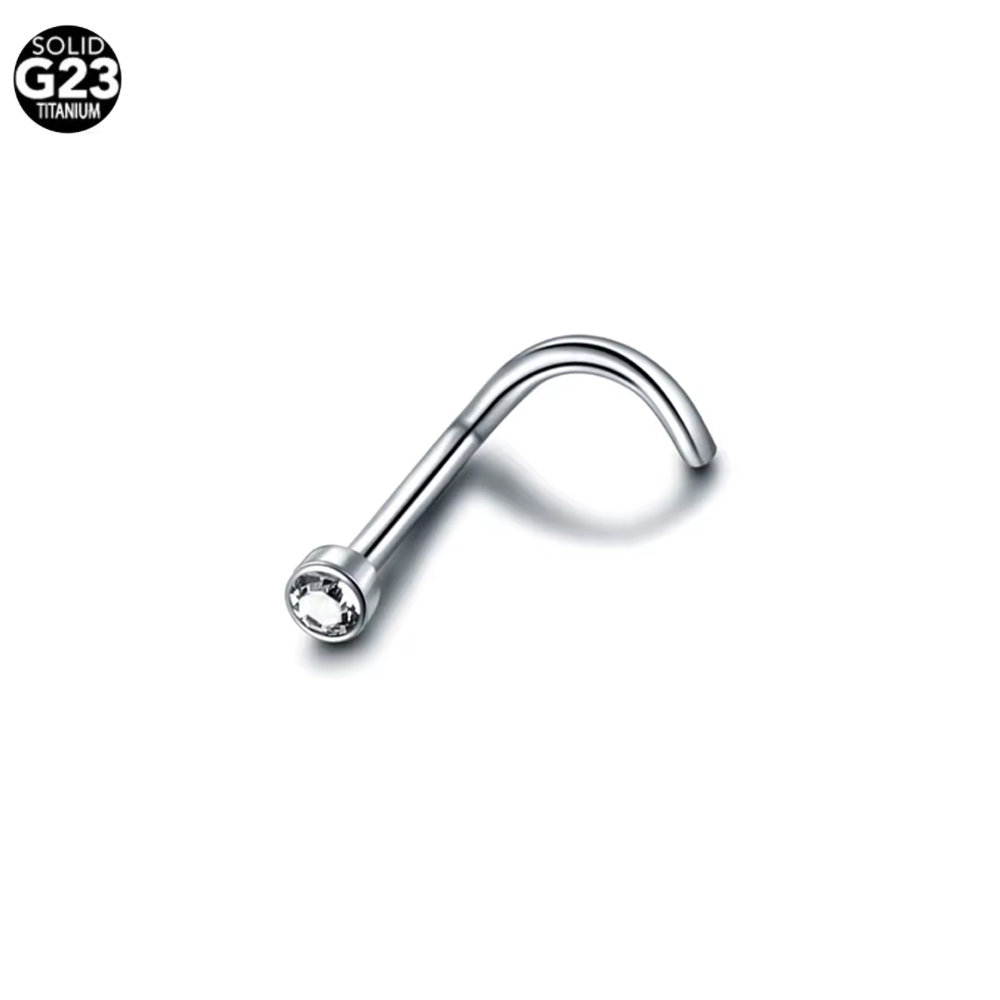 Kolczyk do nosa zakręcony (tzw.pigmej) wykonany z chirurgicznego tytanu G23 z białym kryształem umieszczonym w cylindrze. Najlepszy do pierwszego sterylnego przekłucia (sterylizacja +2zł) oraz dla osób uczulonych na nikiel. Zakręcona końcówka zapobiega przed niespodziewaną utratą kolczyka.
