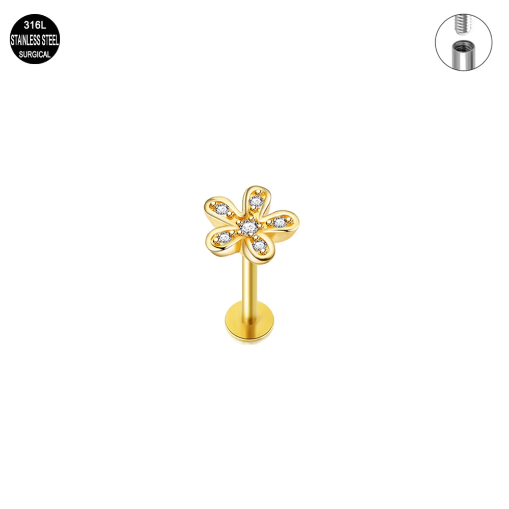 Kolczyk typu labret wykonany ze stali chirurgicznej 316L w kolorze złotym z kwiatuszkiem okraszonym kryształkami . Ozdoba z gwintem wewnętrznym (GW), co znacznie ułatwia przykręcanie nakrętki. Piękny kolczyk do wygojonych kanałów, można sterylizować (+2zł).